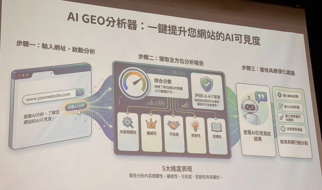 這正是GEO的核心概念:讓AI理解你的專業內容、信任你的資訊,並在生成答案時主動引用你。