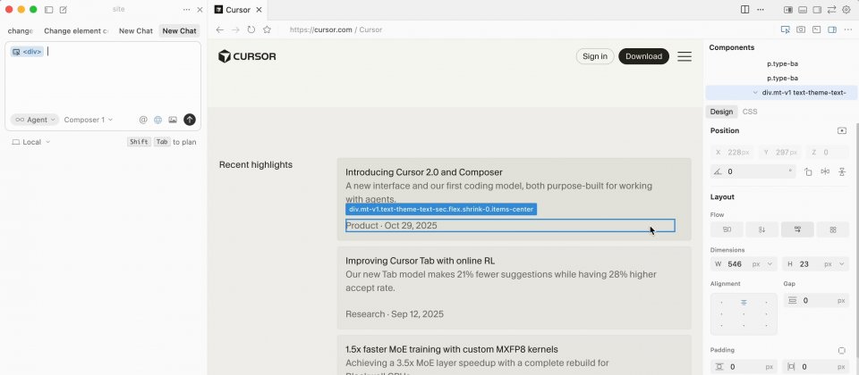 Cursor開發團隊在程式碼編輯器中的瀏覽器(Cursor Browser)加入視覺化編輯器,讓開發者在同一個視窗內同時看到網頁介面、相關程式碼庫與視覺化調整工具。使用者可直接在已算繪的頁面上拖拉元素、檢視元件與屬性,或以點選搭配文字描述提出修改需求,再由代理在程式碼庫中找出對應畫面的元件與相關檔案,並把修改寫回程式碼。
