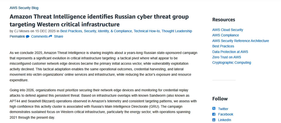 Amazon威脅情報團隊持續追蹤俄羅斯駭客組織Sandworm對西方國家的關鍵基礎設施活動,他們發現今年對方的攻擊戰術出現重大的變化,過往這些駭客偏好利用資安漏洞來入侵受害組織,但他們現在明顯傾向針對邊緣裝置配置不當的情況下手,原因是這麼做能減少攻擊者曝光的機率,並降低所需使用的資源,同時達到相同的攻擊目的,以及收集各式憑證、在受害組織進行橫向移動。對此,AWS呼籲企業組織應優先保護邊緣裝置,監控憑證重放攻擊的活動,來因應相關威脅。