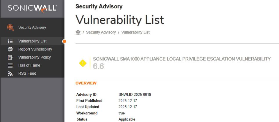 12月17日防火牆製造商SonicWall發布資安公告,指出SSL VPN系統SMA1000的設備管理主控臺(Appliance Management Console,AMC)存在中度風險的本機權限提升漏洞,此漏洞登記為CVE-2025-40602列管,起因是授權不夠完備造成,CVSS風險為6.6分。值得留意的是,該公司已掌握漏洞遭到利用的現象,有人結合今年1月修補的預先身分驗證遠端程式碼執行漏洞CVE-2025-23006(CVSS風險值9.8)加以利用,而能在未經身分驗證的情況下,以root權限遠端執行程式碼。美國網路安全暨基礎設施安全局(CISA)同日警告漏洞已遭利用,將其列入已遭利用的漏洞列表(KEV),限期聯邦機構一週內(12月24日)完成修補。