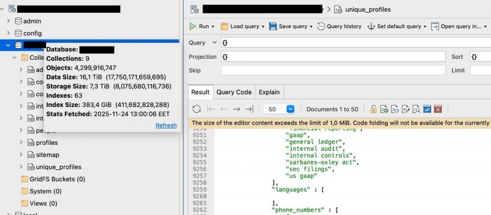 資安媒體Cybernews的研究團隊發現一個未啟用存取驗證的MongoDB資料庫,對外公開曝露於網際網路上。研究團隊指出,該資料庫總量約16.14TB,累計近43億筆紀錄,內容多為用於潛在顧客開發(Lead Generation)的職場與企業相關資料,包含大量疑似取自LinkedIn的個人資料欄位,例如LinkedIn網址與帳號識別、任職資訊與聯絡方式等。