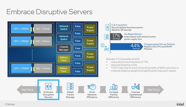在伺服器方面,英特爾IT研發一種解構式伺服器(Disaggregated Server)專利,他們在資料中心內採用刀片式伺服器,提來密度,並將伺服器內的CPU及DRAM獨立出來,汰換伺服器時只要更換CPU及DRAM,保留網路卡、硬碟等其他組件,和傳統汰換整臺伺服器的作法相比,可節省約44%成本。
