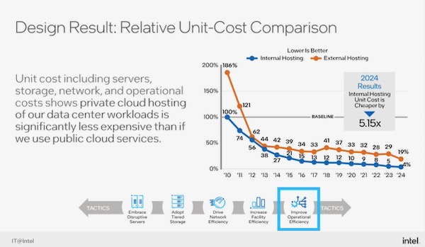 他們從2010年開始比較相同算力資源條件下,自行維運管理資料中心的單位成本,和改用雲端服務的單位成本相差多少,根據英特爾IT的統計,英特爾自行維運管理資料中心的單位成本,如果將2010年定為基期(100%),2024年單位成本已降到4%,雲端服務在此期間單位成本也不斷降低,從2010年的186%降到2024年的19%,明顯雲端維運管理的單位成本降低許多,但英特爾自己維運管理資料中心單位成本降到4%,兩者成本相差5倍。