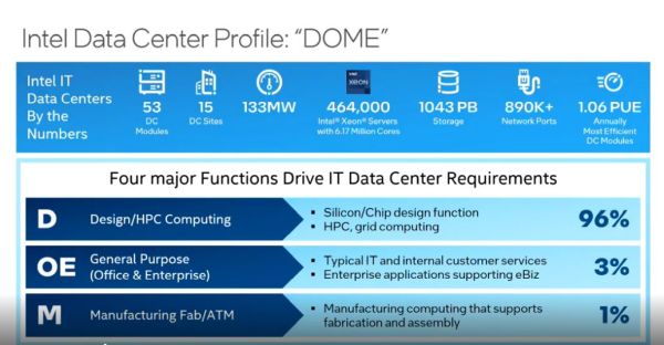 其中「D」代表Design/HPC,為英特爾晶片設計、量產前的工作負載,這部分的運算工作負載占英特爾96%的伺服器;而「OE」則代表一般辦公室或企業營運的Office&Enterprise,這類運算負載為典型的IT運算,要求較高的SLA,但僅占3%伺服器;「M」代表Manufacturing Fab/ATM,主要為支援工廠自動化的工作負載,大多位於工廠附近或周邊,僅占1%伺服器。