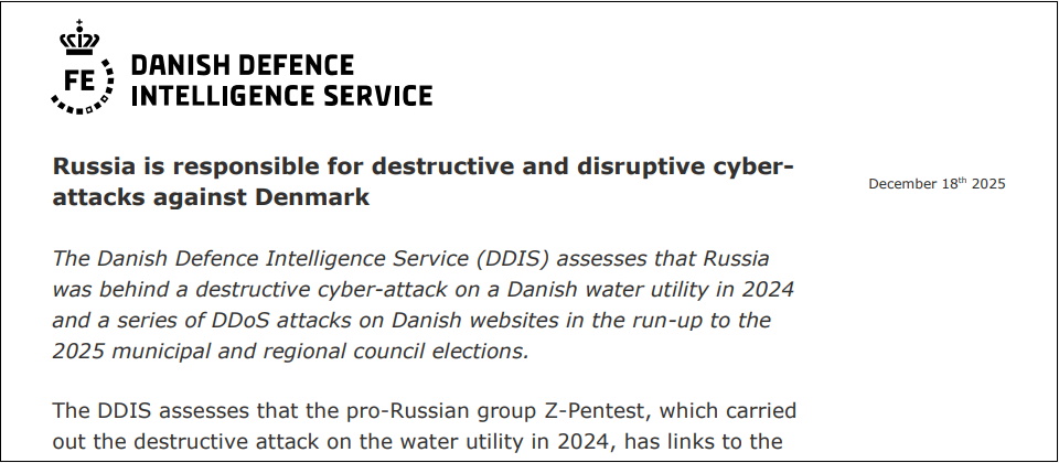 丹麥國防情報局(Danish Defense Intelligence Service,DDIS)指出,2024年對供水廠發動破壞式攻擊的親俄羅斯組織Z-Pentest,以及在2025年初丹麥市長和地方大選後,對該國數個網站發動分散式阻斷服務(DDoS)攻擊的駭客組織NoName057 (16)都和俄國政府有關連。