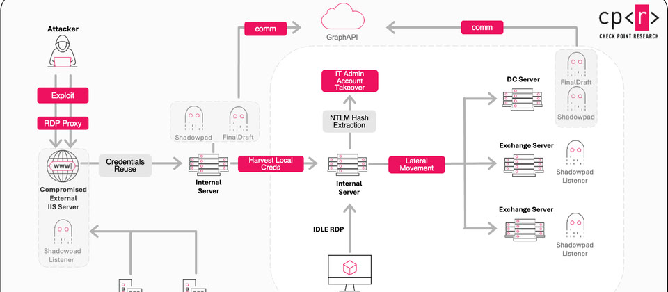 針對這些駭客入侵受害組織的過程,他們通常會運用曾被外洩的金鑰,試圖觸發ASP.NET ViewState反序列化的現象,從而取得初期的存取管道,不過,在部分活動當中,Ref7707利用了SharePoint重大漏洞ToolShell(CVE-2025-53770)來達到目的。Check Point指出,這些駭客於2025年7月就大規模掃描ToolShell,代表他們當時就有能力利用相關漏洞。