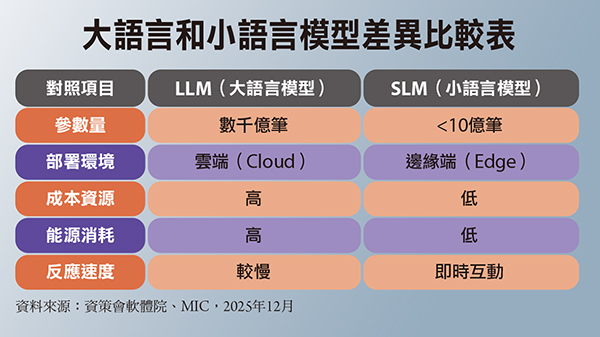 相較於動輒數千億筆參數量的大語言模型(LLM),王義智認為,在2026年的AI關鍵技術中,也必須要關注更為輕量化、追求效率和有利於邊緣運算、參數數量小於10億筆的小語言模型(Small Language Model,SLM)。