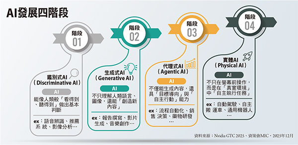 最後第四個階段,王義智則引用黃仁勳的預測指出,未來AI的發展趨勢除了聊天、生成、代理,必須再加一個「實體AI」(Physical AI),這也是AI發展的最後階段。