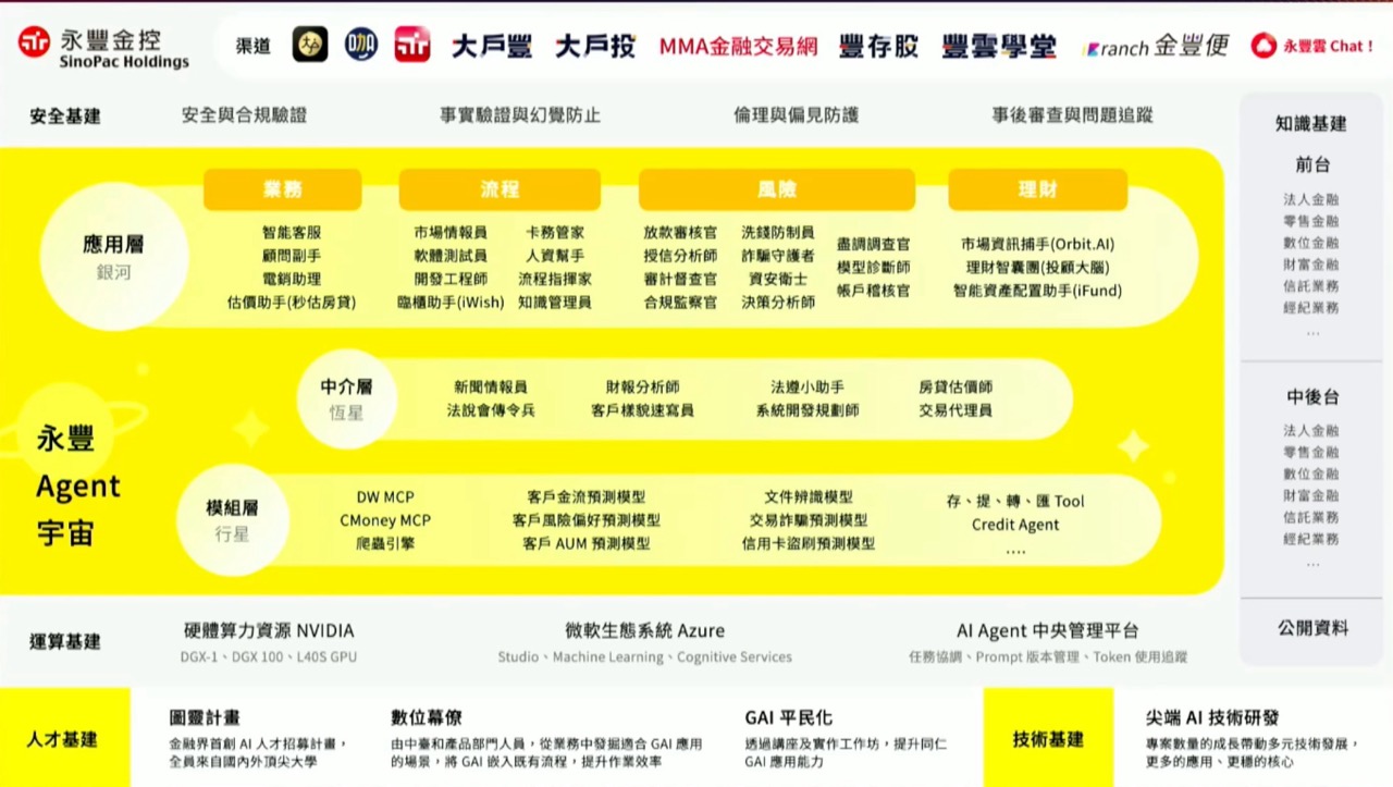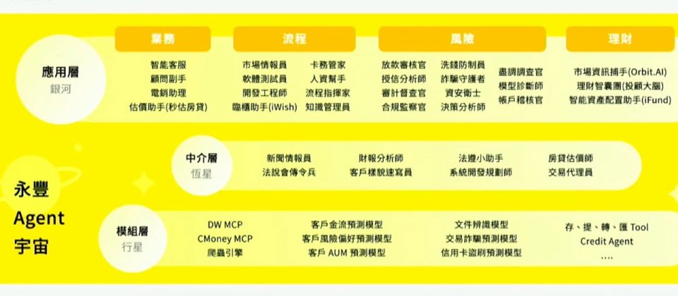 在這個Agent宇宙藍圖中,這些不同的職務名稱,代表了永豐金控想要發展的AI助手或AI代理角色,也可以說是永豐金控整個金融AI應用願景的發展框架。