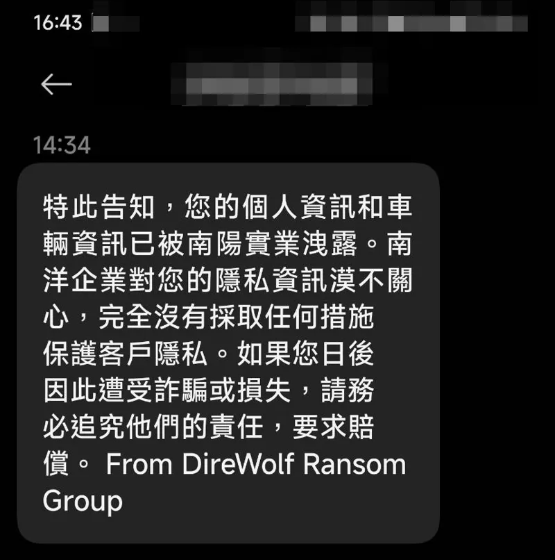 南陽實業傳出遭勒索軟體DireWolf入侵,駭客向車主寄送簡訊聲稱個資已外流