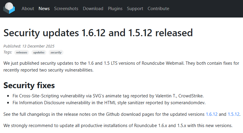 Roundcube開發團隊建議管理員立即升級至1.6.12或1.5.12版,以封堵潛在攻擊途徑,降低系統遭到入侵或資料外洩的風險。