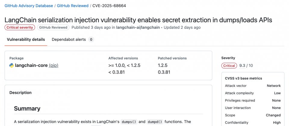 知名大型語言模型調度開源框架LangChain團隊發布安全通報,揭露核心套件langchain-core存在序列化注入漏洞CVE-2025-68664,該漏洞CVSS 3.1基礎分數為9.3,屬重大等級。受影響版本為langchain-core小於0.3.81,或介於1.0.0以上且低於1.2.5。官方已釋出修補版本0.3.81與1.2.5,並同步收緊load()與loads()的預設行為,以降低誤用風險。