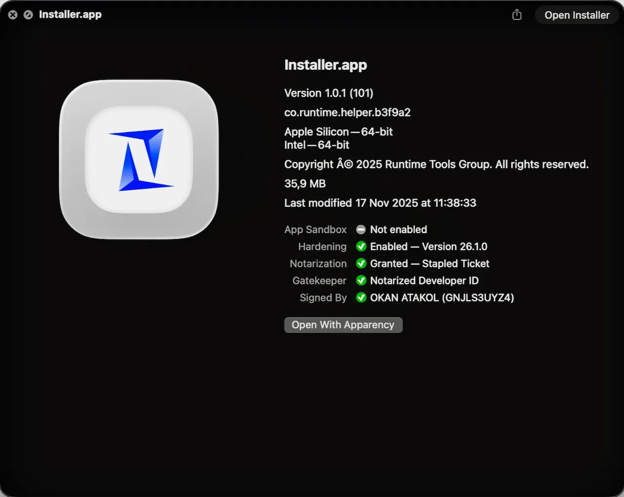 然而,Jamf發現新版本的MacSync Stealer在投放策略上出現關鍵轉變。駭客改以Swift開發一個具備合法程式碼簽署,並通過蘋果軟體公證機制(Notarization)的Mac應用程式作為投放工具。該程式被包裝在磁碟映像檔中,外觀與一般合法App無異,使用者只要依照正常安裝流程雙擊執行,便可通過macOS的Gatekeeper安全機制,全程不需要任何終端機操作。