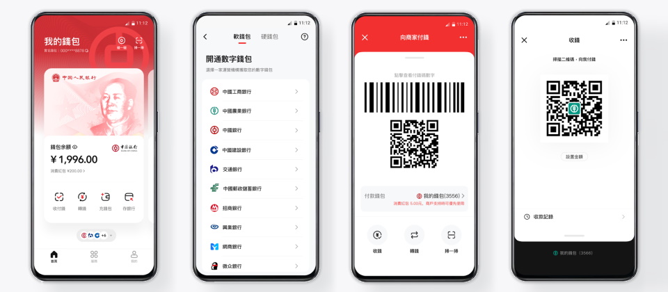 此外,中國央行也在2022年推出數位人民幣錢包App,用戶可透過手機號碼與App中建立數位人民幣錢包,包括匿名制與實名制錢包,後者可直接連接銀行進行充值與提現,之後即可用來支付、收款及轉帳。迄今已有2.3億人註冊數位人民幣錢包,有超過1,800萬個組織或商家註冊數位人民幣錢包App,累積交易筆數為34.8億筆,交易金額為16.7兆元人民幣。