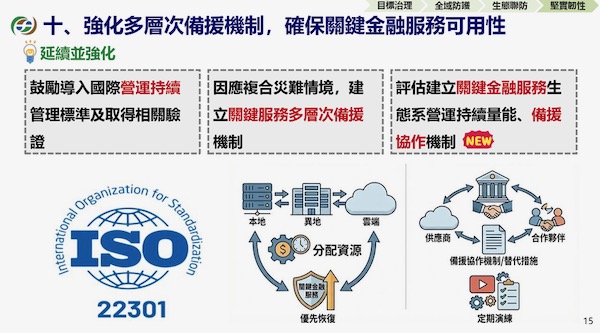 在金融機構的備援機制部分,加強金融服務備援機制,確保服務的可用性,持續推動金融業者導入國際性營運持續的標準之外,也會針對複合式災難情境建立關鍵服務的多層次備援機制;林裕泰指出,假設金融業者面臨複雜的災難情境,如何在資源有限的情形下,調度資源支持關鍵服務,不只是金融業者自身,也包括金融服務的生態合作夥伴,建立備援協作機制。