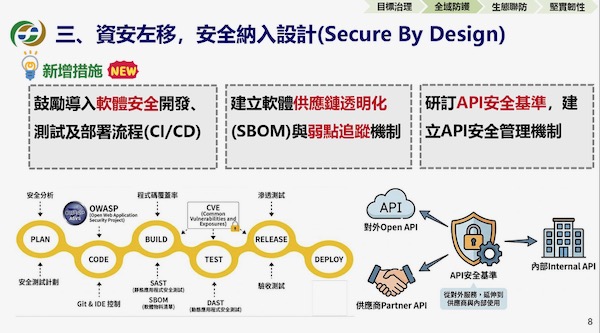 在全域防護方面,除了推動業者導入零信任架構外,也迎合軟體安全設計(Secure By Design)的趨勢;林裕泰指出,過去資安是在軟體開發後部署才開始防護,當後續發現漏洞,需要投入更多的成本處理,因此推動資安左移,鼓勵在軟體設計開發流程中嵌入安全機制,並且跟進國際上軟體供應鏈SBOM透明化,根據軟體清單追蹤重大漏洞,即時修補以降低風險,鼓勵金融業者透過資安左移以降低處理成本。
