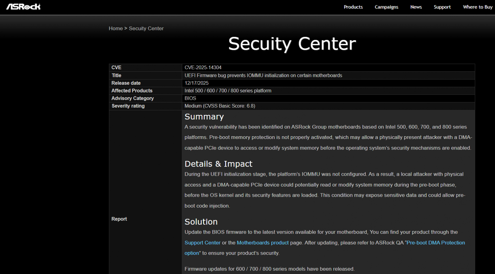 ● CVE-2025-14304:影響華擎科技與其子公司採用Intel 500、600、700、800系列晶片組的ASRock、ASRock Rack與ASRock Industrial主機板