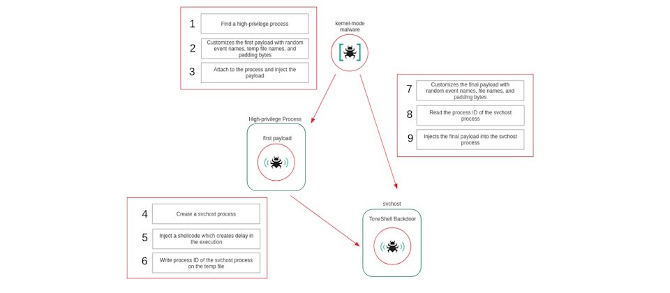 駭客也使用上述rootkit載入ToneShell,此為具備反向Shell功能的木馬程式,由於透過核心驅動程式載入,並於記憶體內執行,使得ToneShell不會在儲存裝置留下運作的痕跡。
