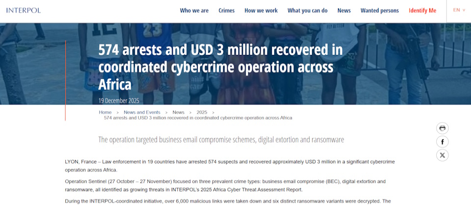 根據Interpol的新聞公告,在為期一個月的查緝行動內,在非洲當地共逮捕574名嫌犯,查扣約300萬美元不法資金,下架超過6,000個惡意連結,並成功解密6種不同的勒索軟體變種。這波執法行動鎖定商業電子郵件詐騙(BEC)、勒索(extortion)及勒索軟體威脅,估計造成的財務損失超過2,100萬美元。