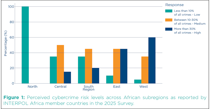 針對非洲地區的網路威脅態勢,Interpol在2025年6月發布的相關報告則進一步揭示,有三分之二的非洲會員國觀察到,網路犯罪已達整體犯罪活動的中度甚至高度占比,西非與東非已有30%以上的通報案件屬於網路犯罪,包括網路詐騙、勒索軟體、商業電子郵件詐騙(BEC),以及性勒索(sextortion)。此外,高達9成的會員國坦言,其防範數位犯罪的偵查技術與法律制度仍有待加強,顯示在網路犯罪規模與複雜度持續升高的情況下,多數國家仍面臨人力、技術與跨境合作不足的挑戰。