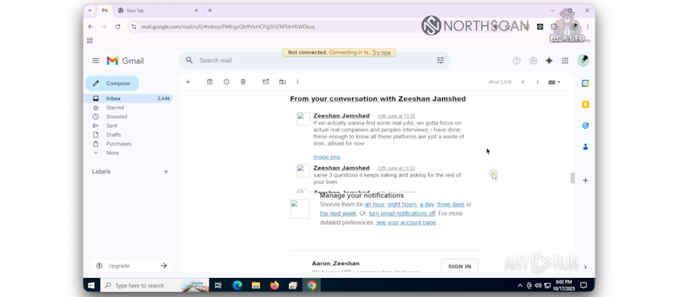 究竟駭客利用開發人員的筆電從事哪些行為,研究人員根據信箱內容發現,駭客訂閱多個求職平臺的職缺資訊,並存取多個Slack工作區與其他合作人士進行通訊,其中一名可能是穆斯林,因為對方表明會因為開齋節或其他穆斯林節慶外出。
