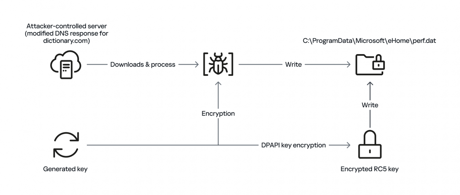資安公司卡巴斯基揭露這些駭客自2022年11月開始從事的高度針對性攻擊,他們針對土耳其、中國,以及印度特定目標從事對手中間人攻擊(AiTM),並採用一系列的複雜手法來進行,持續到2024年11月才結束。其中最引起該公司注意的地方,在於駭客將惡意軟體的加密元件另外存放於伺服器上,而相關元件的用途,就是解析特定網站的DNS請求。再者,這些駭客開發新的惡意程式載入工具,並採用混合加密手法,因此,所有植入受害系統的惡意程式檔案都不同。駭客打造專屬的注入工具,並以DLL側載手法,讓惡意程式MgBot注入合法處理程序,並在記憶體內執行。