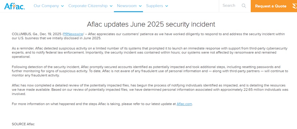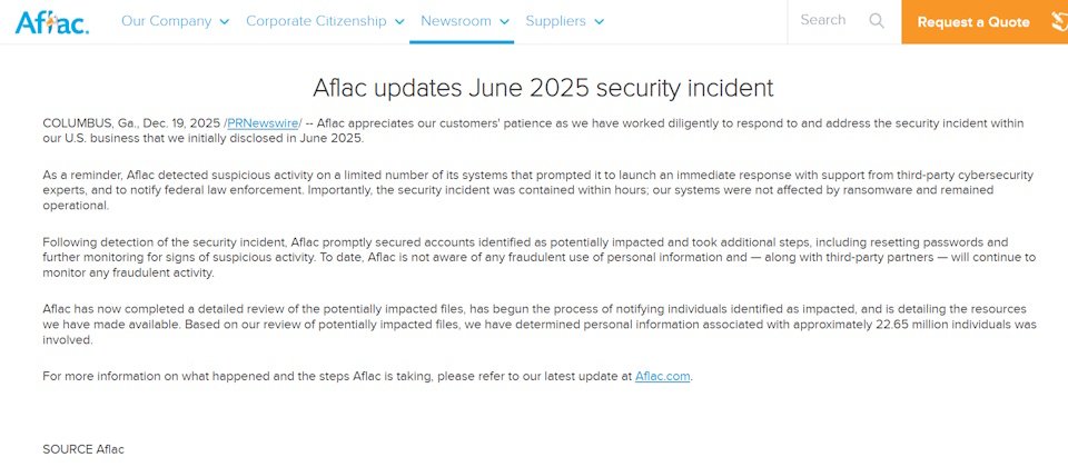 Aflac說明,公司是在去年6月發現這起網路攻擊行動,隨後花了近六個月進行調查。該公司於12月初完成調查,並在聖誕節前夕於網站公告此事及通知受影響人員。