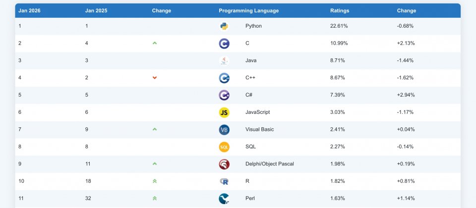 在2025年前十名的排序變動上,C與C++對調位置。Paul Jansen解讀,C++近年加快標準推進速度,但部分較前衛的新機制,例如模組概念,尚未在業界被廣泛採用。相較之下,C保持簡潔與高效,且十分貼合小型嵌入式系統等持續成長的需求。Rust雖在2026年1月攀上第13名創新高,但TIOBE仍認為在嵌入式領域的滲透不易。