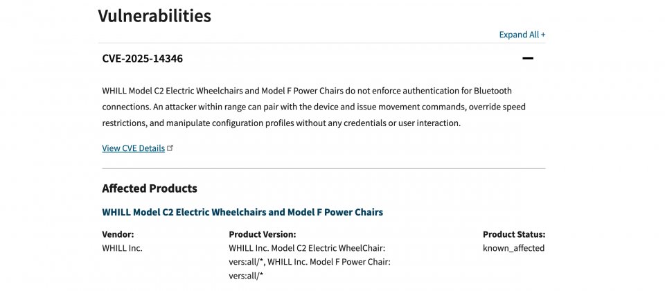 美國網路安全暨基礎設施安全局(CISA)發布工業控制系統醫療資安通報,指出日本行動輔具業者Whill的電動輪椅Model C2與Model F存在嚴重藍牙弱點CVE-2025-14346。通報評估該漏洞CVSS v3.1分數為9.8,屬極高風險等級。一旦遭利用,攻擊者只要在藍牙有效範圍內,就可能接管裝置控制。