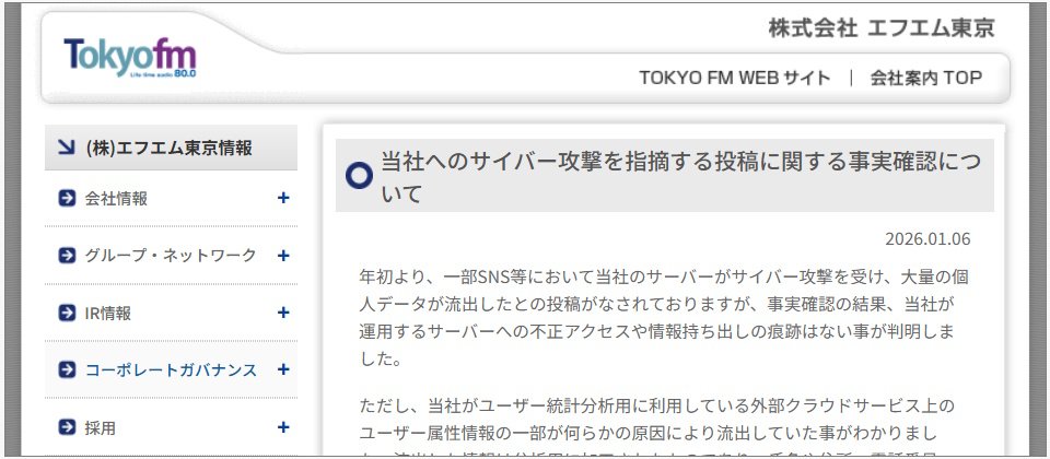 資安業者Hackmanac在1月1日發現駭客論壇上一名名為victim的人士,宣稱駭入東京FM廣播(Tokyo FM Broadcasting),據稱竊得的300萬筆記錄。外洩的個資包含姓名、電子郵件、出生日期、IP、使用者代理人字串、工作資訊、多個內部系統的登入ID。