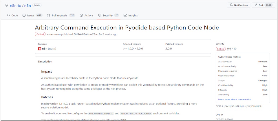 開源工作流程自動化平臺n8n被揭露存在一項重大資安漏洞,可能讓已通過身分驗證、且具備建立或修改流程權限的使用者,在特定條件下於執行n8n的主機上執行任意系統指令。該漏洞編號為CVE-2025-68668,CVSS風險評分高達9.9。