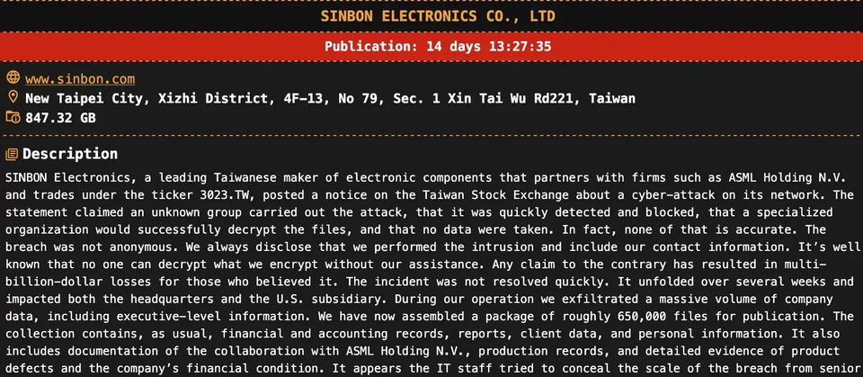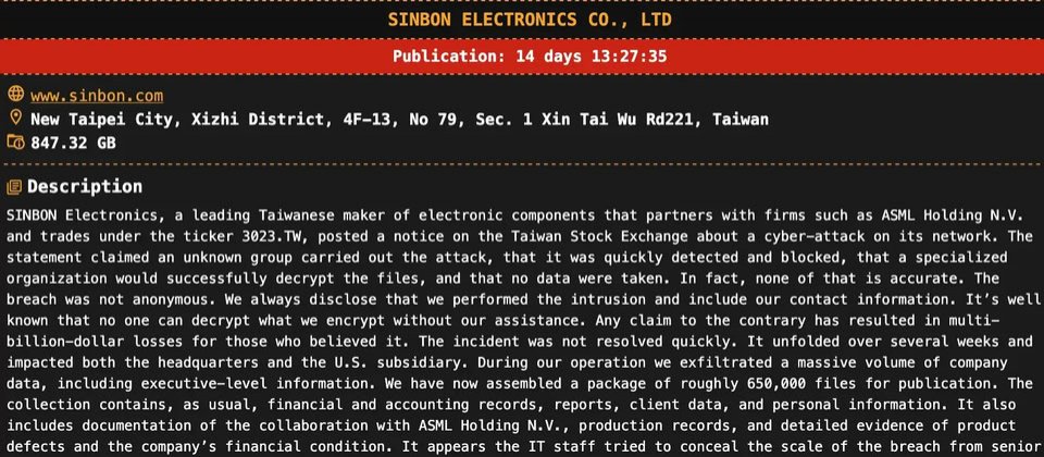 根據Cybersecurity News Everyday、Ransomware.Live,以及RedPacket Security等威脅情報網站公布的消息,勒索軟體駭客組織DragonForce於1月2日宣稱,他們入侵了總部位於新北市的Sinbon Electronics(www.sinbon.com),竊得847.32 GB資料,約有65萬個檔案,這些資料來自臺灣總部與美國子公司。駭客揚言,若是信邦不予理會,他們將在兩週後公布竊得資料。針對此事,國內媒體民視新聞網前幾天也跟進報導,不過詭異的是,該新聞目前已下架。