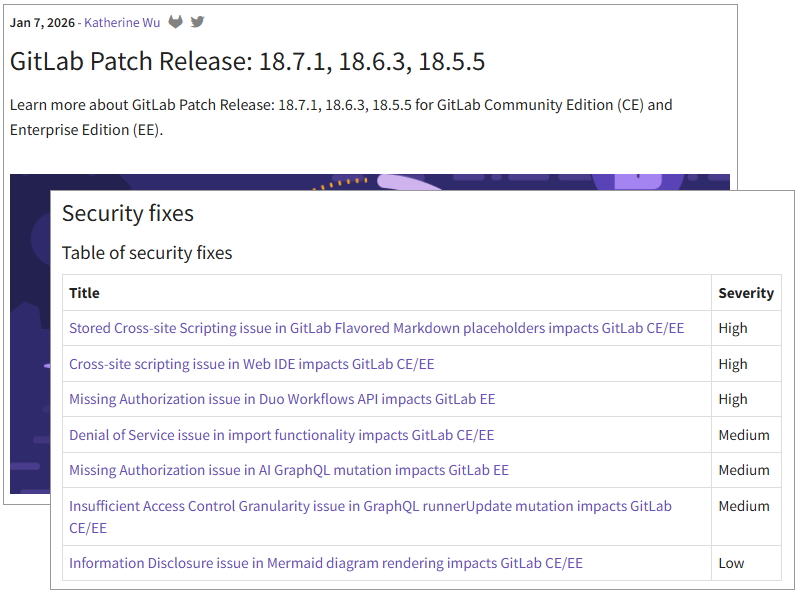 程式碼代管與DevOps平臺GitLab於1月7日發布18.7.1、18.6.3與18.5.5版本,修正多項資安漏洞,涵蓋跨站指令碼(XSS)、授權檢查缺失、拒絕服務(DoS)與資訊洩露等風險,其中部分漏洞風險評分達高風險等級,可能影響GitLab多項核心功能與平臺存取控制機制。官方強烈建議採用自管(self-managed)部署的用戶,儘速升級以降低風險。至於GitLab.com已完成更新,GitLab Dedicated用戶則不受影響。