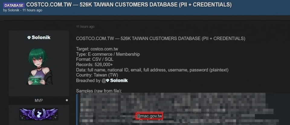 根據自由時報的報導,自稱是Solonik的人士於1月7日宣稱,他握有臺灣Costco(好市多)會員個資52.6萬筆,涵蓋會員姓名、身分證字號、電子郵件信箱,以及明文帳號密碼等資料,打算出售這批資料並公布部分內容取信買家。對此,臺灣好市多表示,經確認這批資料並非該公司會員個資,他們相關系統皆由公司自行開發與維護,資料存放於總公司機房,並未採用外部系統廠商的資料管理程式,好市多強調,保障會員權益為他們的一貫原則。
