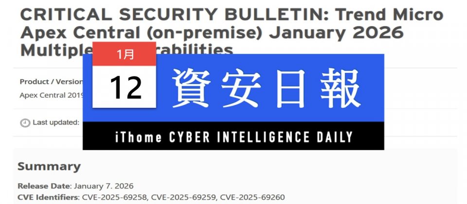 1月7日趨勢科技發出安全公告及更新版軟體,修補集中管理控制臺Apex Central資安漏洞CVE-2025-69258、CVE-2025-69259,以及CVE-2025-69260,這些漏洞影響內部建置的Windows版本,該公司發布Build 7190版予以修補。