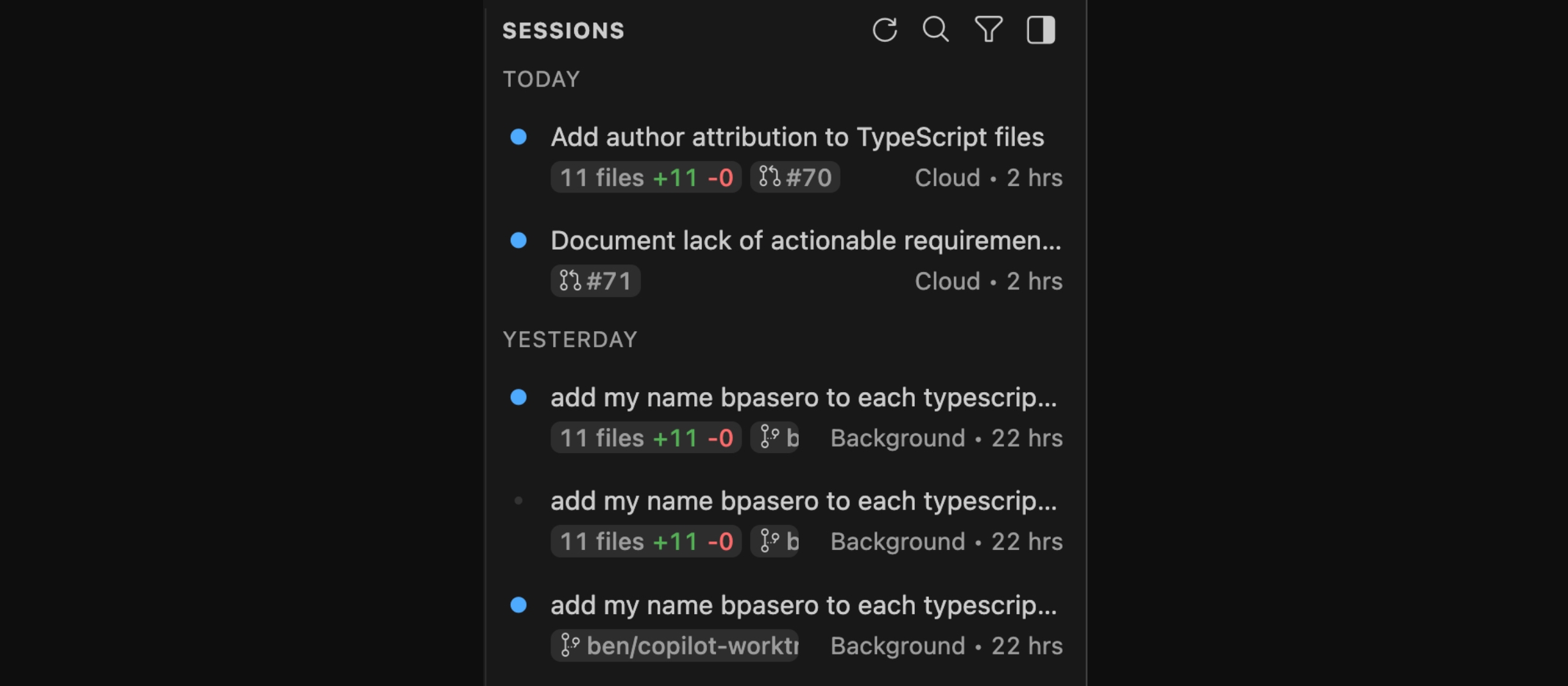 隨著代理技能上線,VS Code也同步強化代理工作階段管理,新版代理工作階段檢視介面改善鍵盤操作與可近用性,並依狀態與時間分組,方便掌握進度。檢視介面也會提示該工作階段涵蓋的檔案變更與關聯的拉取請求,並支援一次封存多個工作階段。聊天的快速選擇器也改以代理工作階段為基礎,使用者可回到既有對話並進行封存、重新命名或刪除。