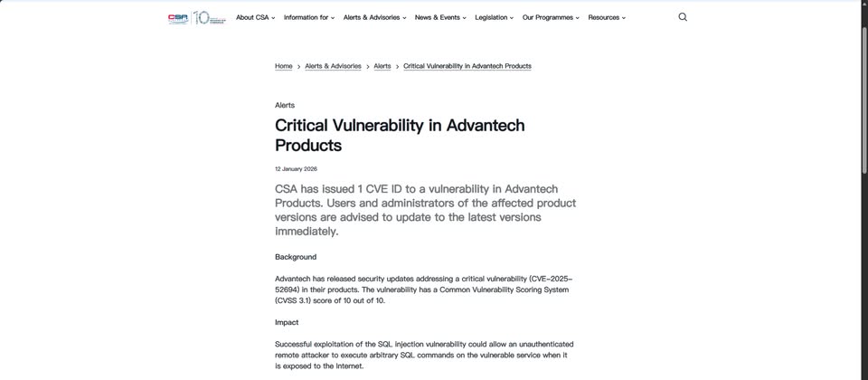 1月12日新加坡網路安全局(Cyber Security Agency of Singapore,CSA)提出警告,指出工業電腦龍頭與物聯網解決方案龍頭研華科技(Advantech)發布更新,修補IoTSuite 3D Visualization(SaaS Composer)重大層級漏洞CVE-2025-52694,此為SQL注入漏洞,只要存在弱點的系統曝露於網際網路,未經身分驗證的攻擊者可遠端觸發漏洞,使該系統執行任何SQL命令,CVSS風險評分達到10分(滿分10分),相當危險,呼籲用戶要儘速安裝更新。