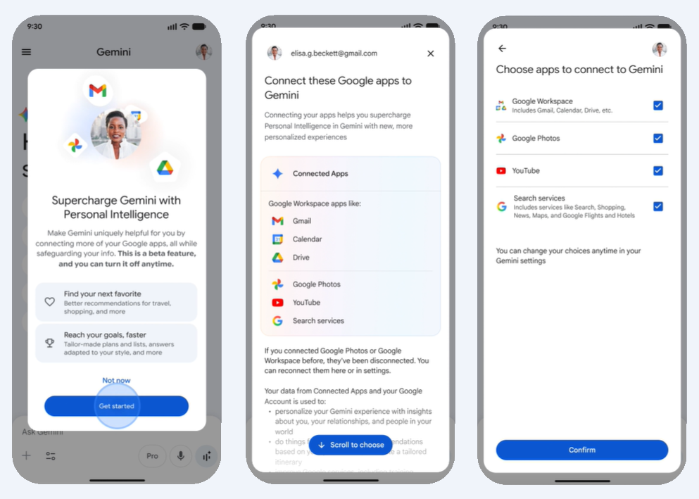 為此,Personal Intelligence首先整合的是Google自己的服務。用戶經由Gemini設定選單啟動本功能,即可和列出的Google服務,如Gmail、YouTube、相簿、搜尋或Google Workspace建立連結,以便Gemini從中搜尋資訊生成個人化回應。