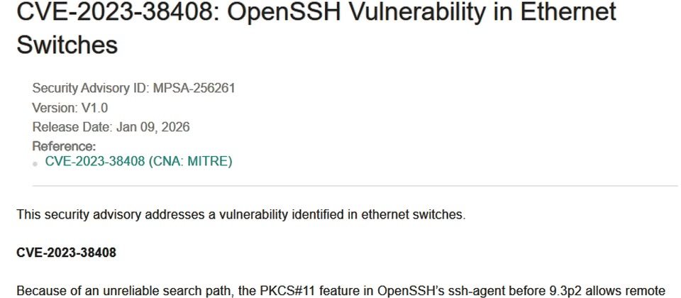 工業網路設備廠商四零四科技(Moxa)於1月9日發布資安公告,他們針對交換器設備修補OpenSSH重大漏洞CVE-2023-38408,若是攻擊者成功利用,就能在特定代理程式將流量轉發到攻擊者控制的系統時,得以遠端執行任意的程式碼,CVSS風險評為9.8分(滿分10分),相當危險,影響EDS-G4000與RKS-G4000系列的機種,該公司已推出新版韌體修補。