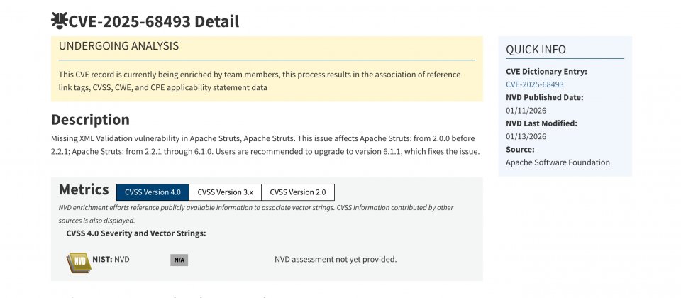 Java Web應用框架Apache Struts專案發布安全公告,指出其XWork元件在解析XML設定檔時存在XML外部實體(XXE)注入風險,最嚴重可能導致敏感資料外洩、阻斷服務(DoS),或被用於伺服器端請求偽造(SSRF)。該漏洞編號CVE-2025-68493為重要等級,建議使用者至少升級至Struts 6.1.1以完成修補。