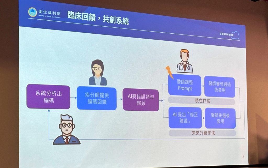 目前的除錯流程,仍以人工回饋為主。游家鑫說明,當系統給出推薦編碼後,會由疾病分類師判斷是否正確,並標註錯誤類型,例如「SNOMED CT編碼階層不夠細」或「出現不存在的編碼」,再由工研院調整提示(Prompt),經醫師確認後更新套用。
