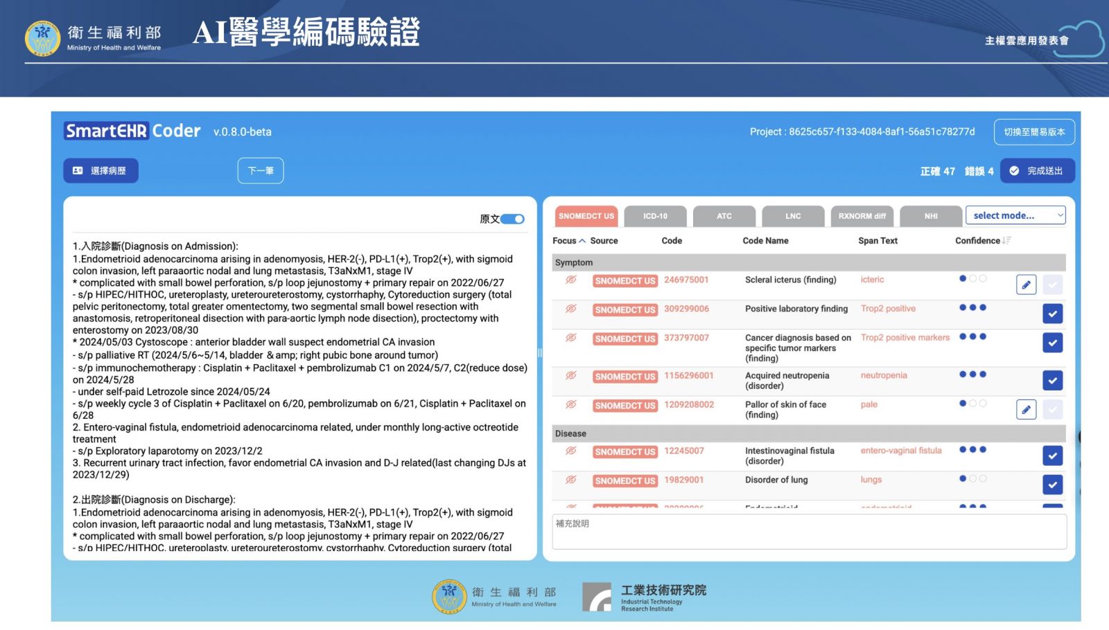 圖說:左側為病歷內容,右側為系統推薦的編碼結果,疾分師可逐筆勾選是否正確。