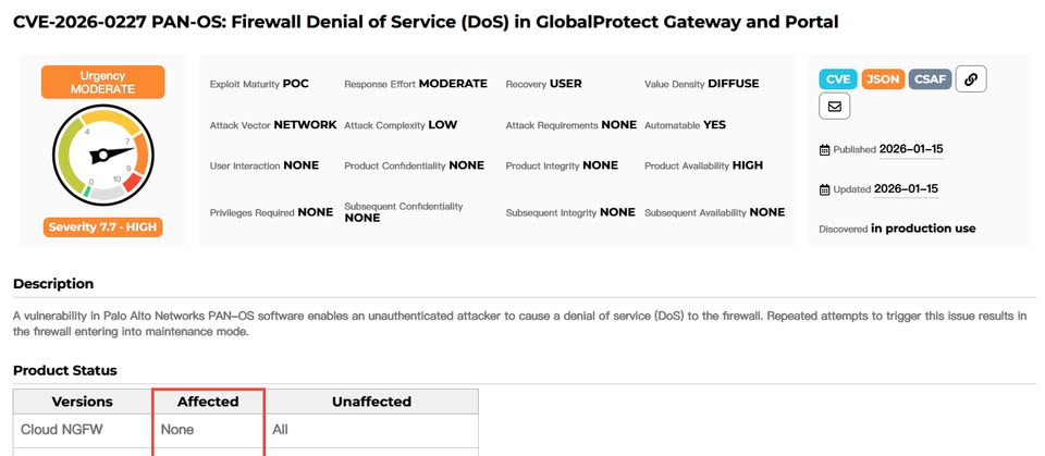 本週資安公司Palo Alto Networks修補高風險阻斷服務(DoS)漏洞,引起各家資安新聞媒體報導。1月15日Palo Alto Networks發布資安公告,指出防火牆作業系統PAN-OS存在高風險漏洞CVE-2026-0227,未經身分驗證的攻擊者可導致防火牆出現服務中斷的現象,若反覆觸發漏洞,還會讓防火牆進入維護模式,4.0版CVSS風險為7.7分,影響PAN-OS及SASE平臺Prisma Access用戶,該公司已為10.2至12.1版PAN-OS,以及10.2與11.2版Prisma Access發布更新修補,由於沒有其他替代緩解措施,他們呼籲用戶要儘速安裝更新。
