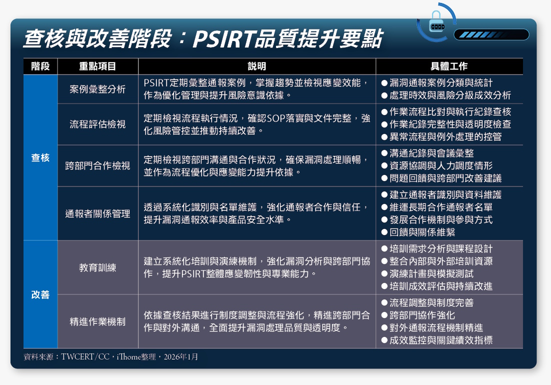 至於改善階段,聚焦於教育訓練的強化、作業機制的優化,確保組織在每次事件後,都能讓PSIRT能力持續精進。
