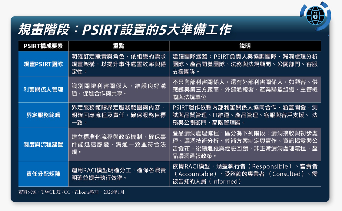 最近臺灣政府也順應這個全球潮流,在2025年12月26日,由TWCERT/CC發布《產品資安事件應變團隊PSIRT建置參考指引(草案)》,提供企業易於依循的導入方向。