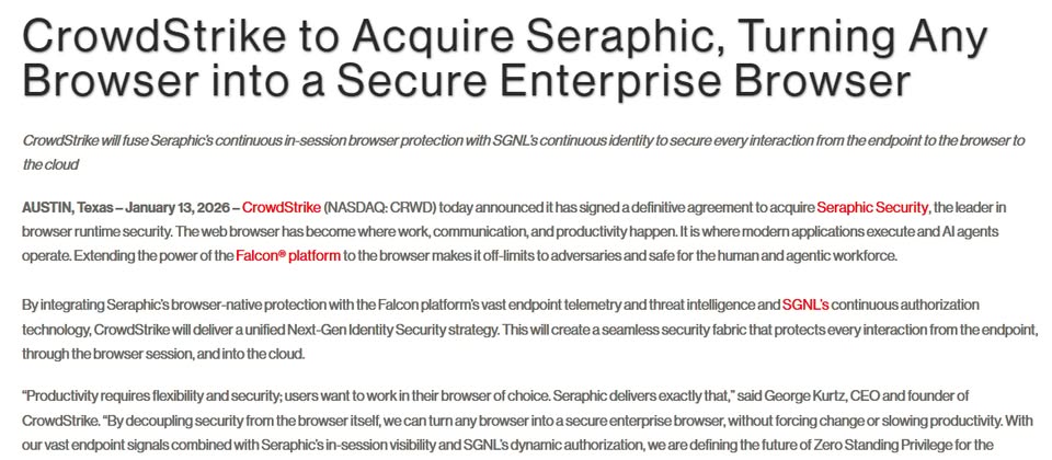 1月13日資安廠商CrowdStrike正式宣布,他們與瀏覽器安全新創公司Seraphic簽署最終併購協議,預計於CrowdStrike的2027財年第一季完成交易,外傳併購金額為4.2億美元。由於不到一週前CrowdStrike才以7.2億買下身分安全即時授權公司SGNL,接連併購新創公司的舉動引起各界關注。