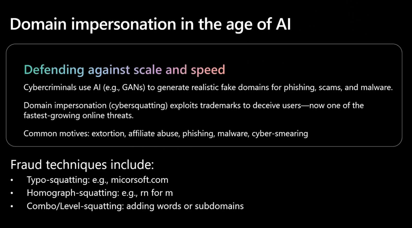 Anujh Tewari強調,微軟已觀察到,現在犯罪分子開始利用生成對抗網路(GANs)等AI技術,自動學習合法網域的命名邏輯,生成高度逼真的虛假網域。常見的網域冒充手法,大致可分為三類,包括:●誤植域名搶先註冊(Typo-squatting),透過刻意拼錯字母來混淆視聽;●同形異義字搶先註冊(Homograph-squatting),像是rn與m相像字型混淆;●組合層級搶先註冊 (Combo/Level-squatting),增加額外單字或子網域。
