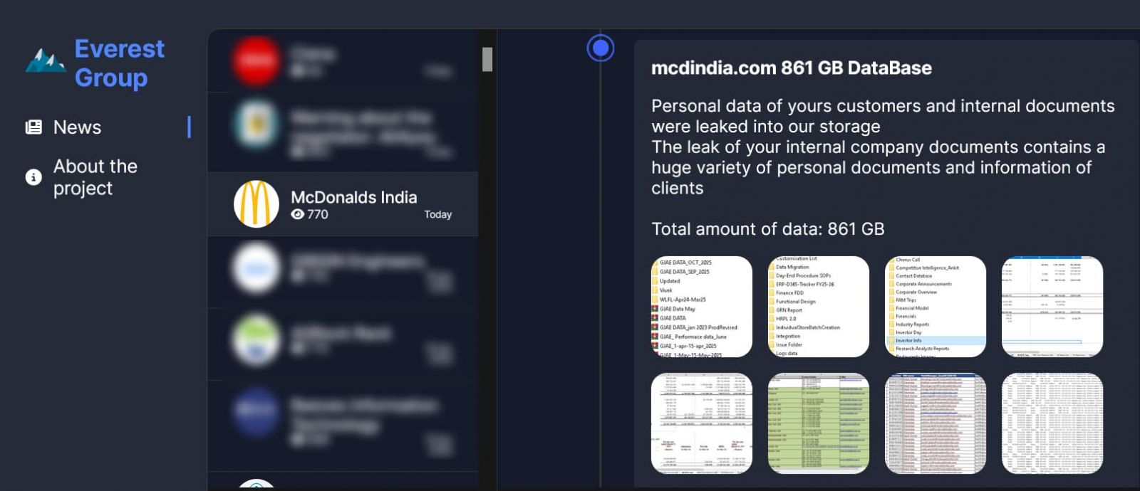 這個和俄國政府有關聯的駭客組織在地下論壇張貼公告,說手中持有印度麥當勞內部文件及客戶資料,共861 GB。駭客還貼出螢幕截圖以證實其真實性。資安媒體HackRead分析這些截圖,判斷是2023年到2026年的財務報表、稽核資料、成本追蹤表、ERP搬移檔案、定價資料,以及其他敏感內部通訊。
