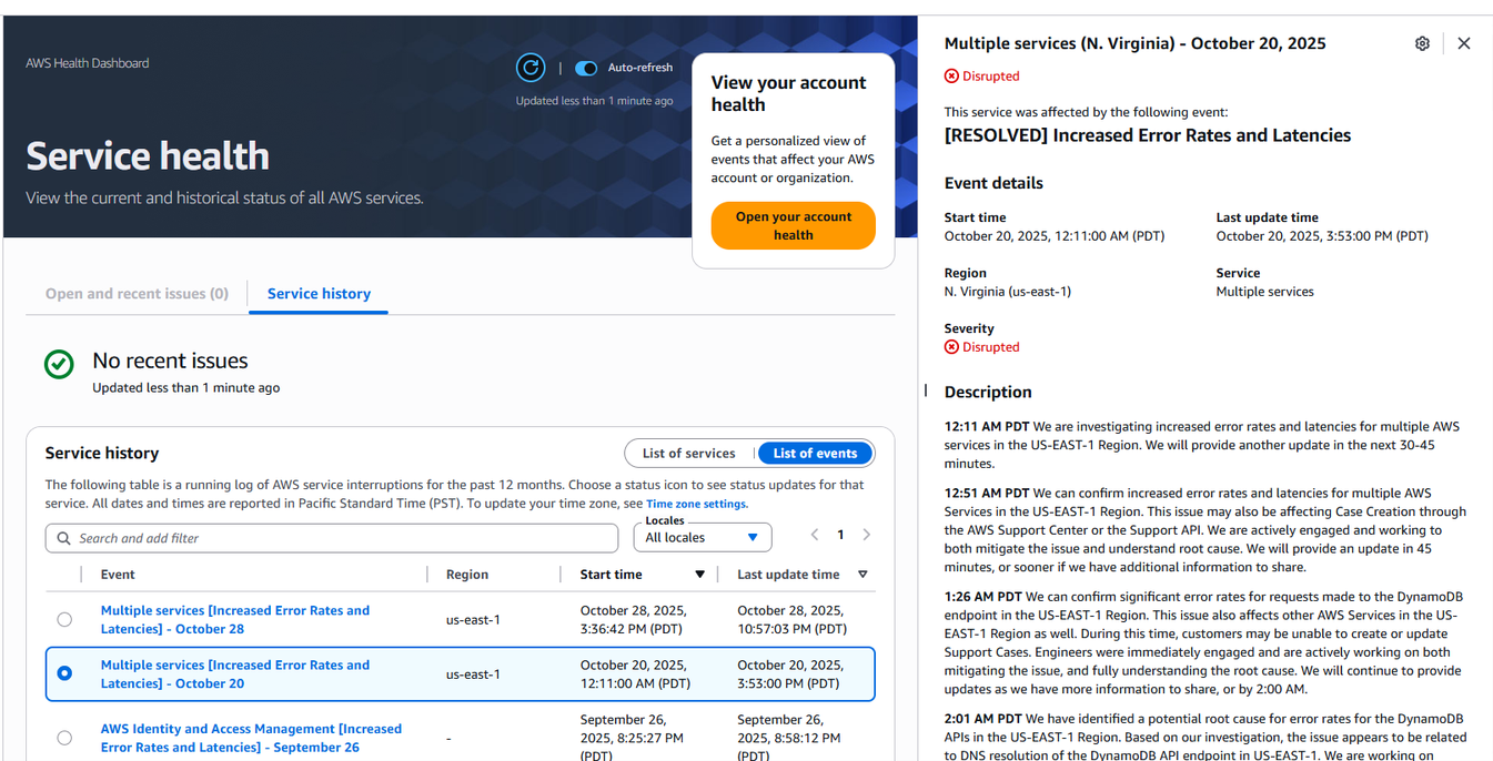 AWS位於美國維吉尼亞州北部的資料中心服務區域(Region)US-EAST-1,於太平洋時間(PDT)2025年10月19日至20日(臺灣時間10月20日至21日)發生大規模雲端服務中斷事故。